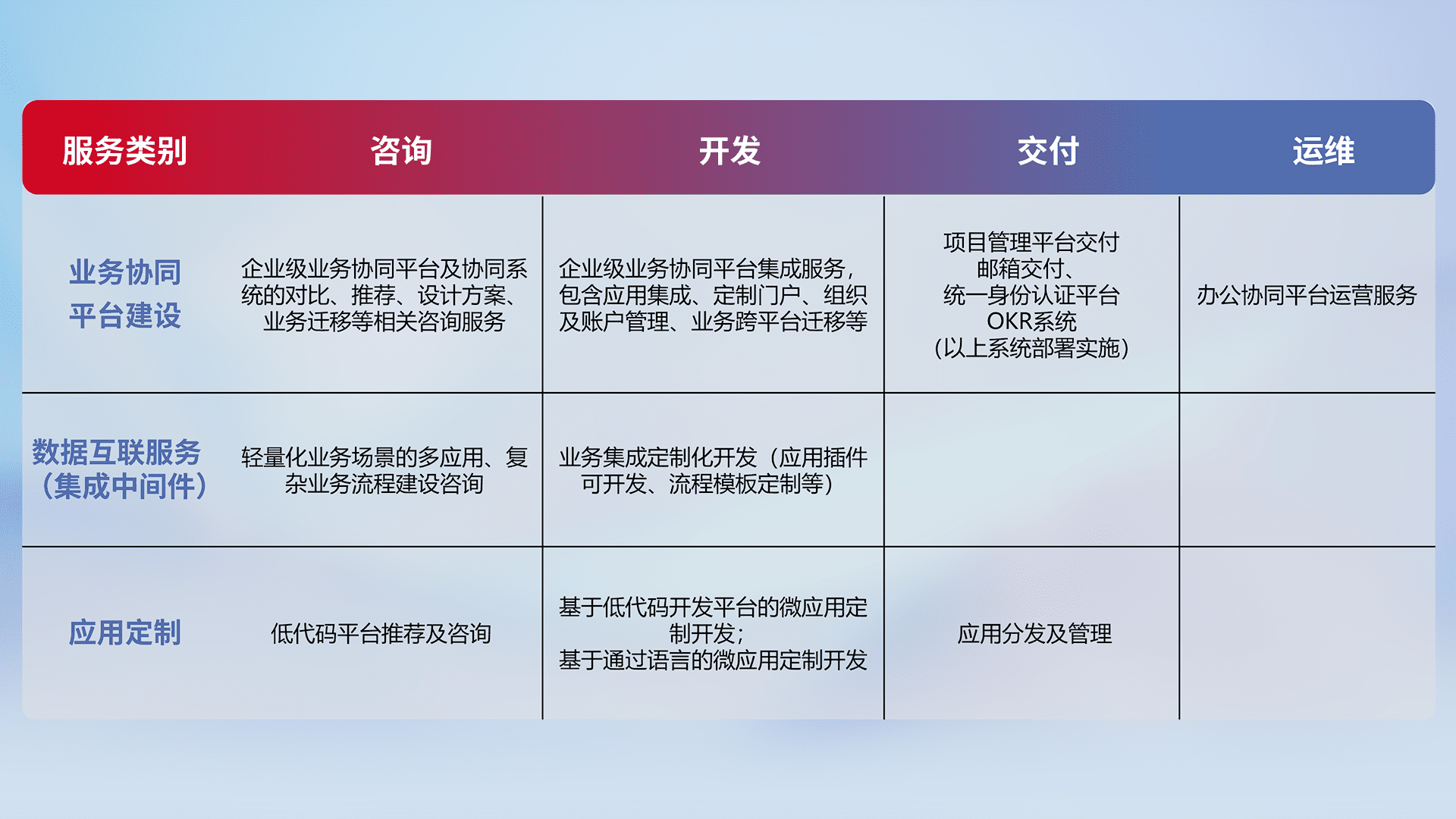 针对钉钉、、企微、、IDaas等平台级产品提供产品的规划、、、、方案、、、交付、、定制化开发等服务,,,,实现如统一协同办公、、智能客户服务、、、、混合会议管理、、智能数据查询、、、等业务场景,,,实现数字化转型。。。